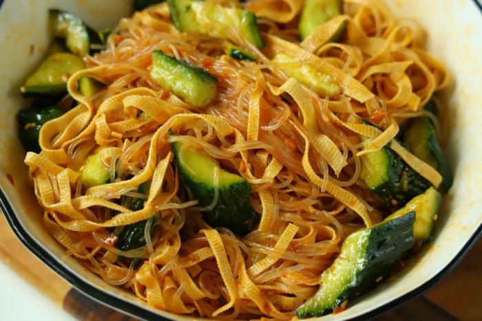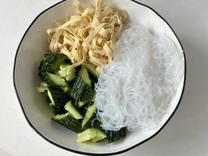 先來處理我們所需要的食材:粉絲提前泡軟過一下開水,再過一下涼水,這樣粉絲也不會坨,瀝乾水分放在碗中;千張切絲之後開水焯水,瀝乾水分加在碗中;黃瓜拍碎一點切小塊裝在碗中,黃瓜可以提前加點鹽殺一下水分,這樣會更入味兒;