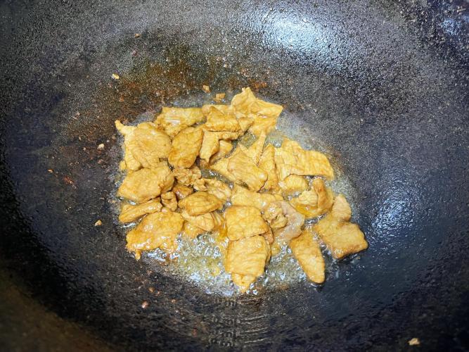 3、熱鍋涼油(鐵鍋燒到冒青煙再倒油),蒜片小米辣"滋啦"一聲爆香,醃好的牛肉片"譁"地倒進去。先別急著翻動,等貼著鍋底那面微微焦黃,再快速劃拉散,肉片變色馬上盛出來。