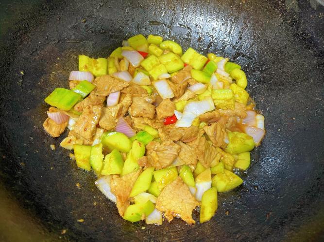4、就著鍋底餘油,洋蔥片炒到半透明,黃瓜塊"哐當"倒進去,猛火顛兩下鍋。把牛肉回鍋,加1勺生抽、1勺蠔油、半勺白糖,沿著鍋邊淋兩勺開水(千萬別用涼水!),大火翻炒30秒立馬關火。