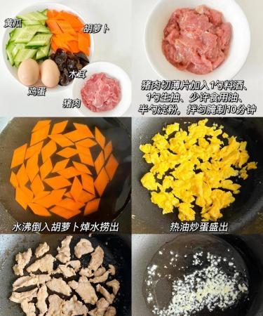 食材:豬肉、雞蛋、黃瓜、胡蘿蔔、木耳、蒜