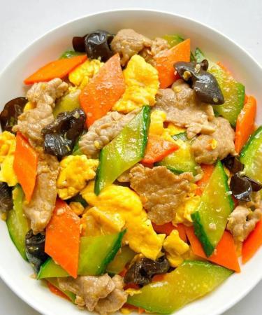 今天吃一道下飯家常菜,木須肉!有葷有素還有蛋,營養均衡,懶的時候炒這樣一盤就夠了肉片嫩滑,黃瓜片清爽解膩,搭配大米飯太香啦~