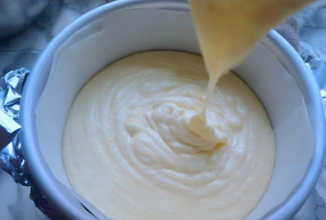 第三步:把蛋白霜分3次加入到蛋黃糊中翻拌均勻,翻拌成細膩的乳酪蛋糕糊,翻拌的過程一定不要畫圈攪拌,防止麵粉出筋影響漲發。把6寸蛋糕模具洗淨擦乾,倒入乳酪蛋糕糊,震幾下使之平整。