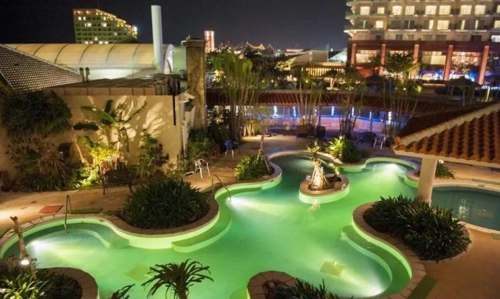 從設施上看,這裡也設有室內、室外游泳場,大眾浴等,在酒店大廳還設有鐳射噴泉show,同時還有包含24種海洋生物的水族館,在這一家酒店,所有的遊玩都可以享受到!