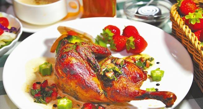 泡完暖湯,「湖畔花時間」也有自家特色的草莓料理,雖然前陣子草莓遭寒害,但不影響草莓料理供應。「烤草莓啤酒雞」先用草莓生啤幫半雞按摩,使肉質軟嫩,再加入香料醃漬二至三天,顧客點單後,送入烤爐烘製20分鐘,烤到表皮酥黃、酒味盡失,此時留下的只有小麥與草莓香,搭配切丁草莓、蘿勒拌入葡萄醋當淋醬,光聞酸香氣息就教人口水直流!