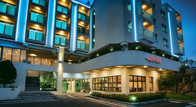 酒店訂的是濟州市海邊上的一個叫濟州CIEL BLEU酒店,海景房含雙早500多元一晚,酒店周圍環境非常不錯,酒店門口的海邊就是典型的濟州島風景,黑岩石灘,海邊上餐廳咖啡廳非常的寧靜安逸,比較適合度假,去市區跟機場大概也就在幾分鐘的路程吧,很方便。