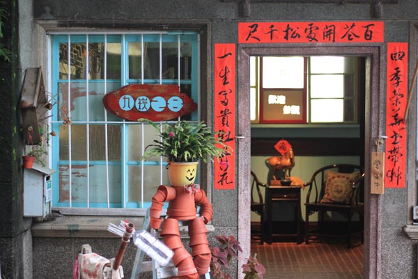 "九崁28"的老闆九哥是在偶然的機會造訪香草街屋時,才知道原來淡水還有儲存如此有韻味的古街,於是決定要在這裡實踐他的夢想,尋尋覓覓中發現這間快坍塌約5年沒人使用的古宅。老房子跟廢墟差不多,多處結構損壞、腐爛,地板凹陷。雖然如此,他還是毅然決然地租下,令人稱讚的是,九哥把它從破爛廢墟整理成藝文空間。更難得的是,他珍惜老屋裡的每件老物,所以用原本屋裡的木頭修舊如舊,或是把灶腳蒸籠變成吊在二樓天花板的燈飾,以及把鍋子加上玻璃就變成桌子,還原老屋生命力,同時也提供他的藝術家朋友們在店裡展售作品。